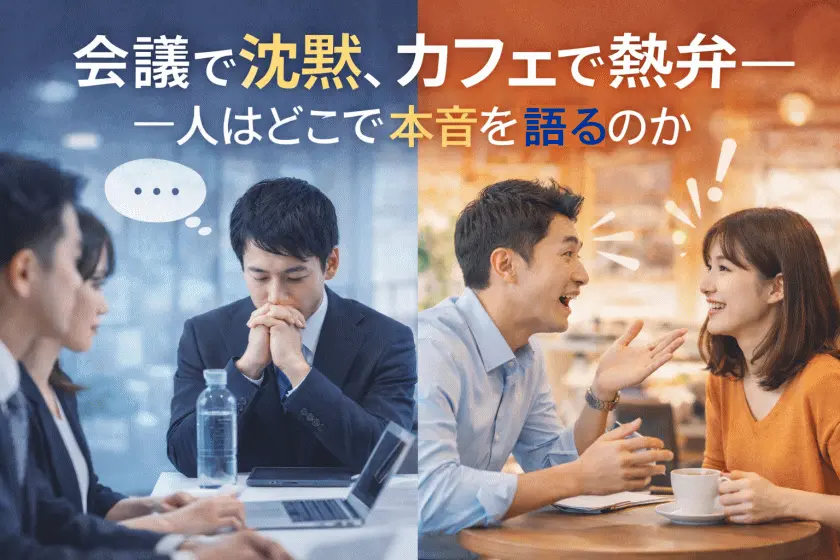 会議室では誰も発言しないのに、カフェに移動すると同じ人が驚くほどよく話す。 企画担当者や営業の現場にいると、こうしたギャップに出会うことが少なくありません。